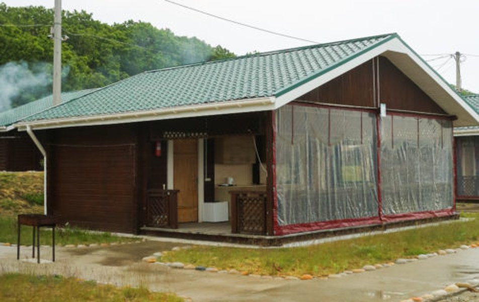 В домике: кровати односпальные, кухонная мебель, прикроватные тумбочки, стол, стулья, мини-кухня, мини-холодильник, набор посуды, плита электрическая, телевизор, электрочайник