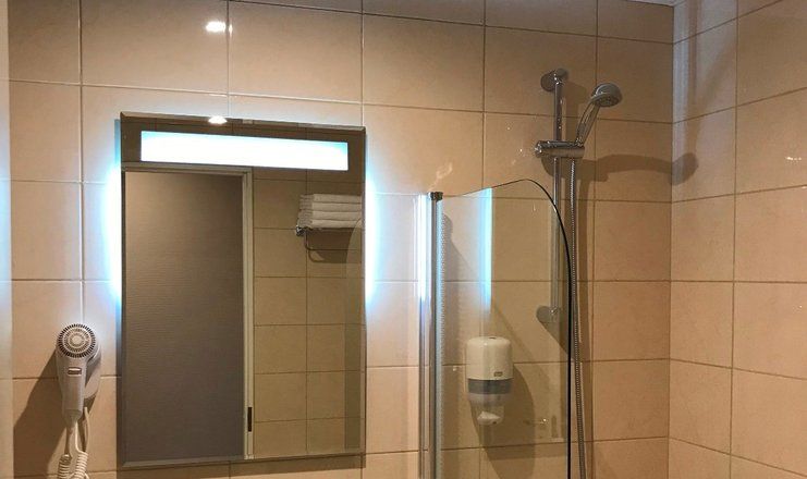 Санузел: душевая кабина, раковина, унитаз, фен, гигиенические принадлежности, тапочки