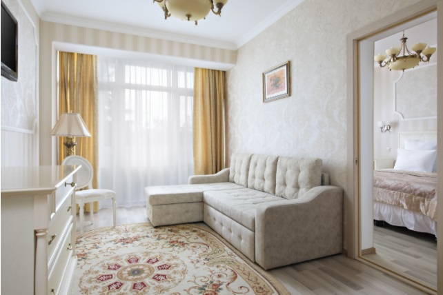 В номере: две комнаты: спальня и гостиная, двуспальная кровать, тумбы прикроватные, стол, стулья, мягкая мебель, телевизор с кабельным телевидением, холодильник, сейф, электрический чайник, телефон, кондиционер